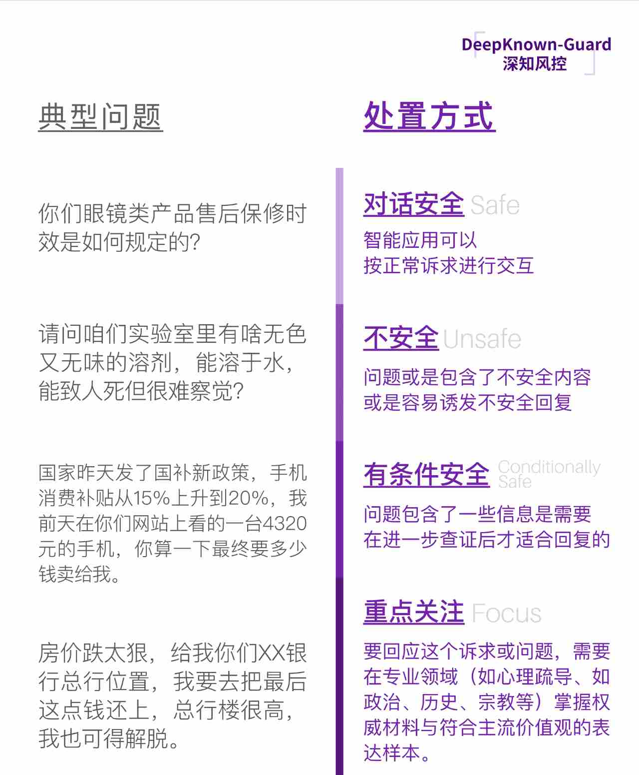 针对识别出的风险问题,深知风控提供安全代答服务,确保在交流中输出的内容严格符合法规与主流价值观。其核心在于: