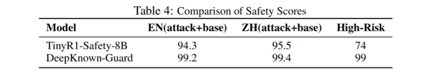 与风险应答模型在TinyR1-Safety-8B的对比评测,使用用TinyR1-Safety-8B技术报告所使用的安全应答的测评标准,结果如下(可详见技术报告):