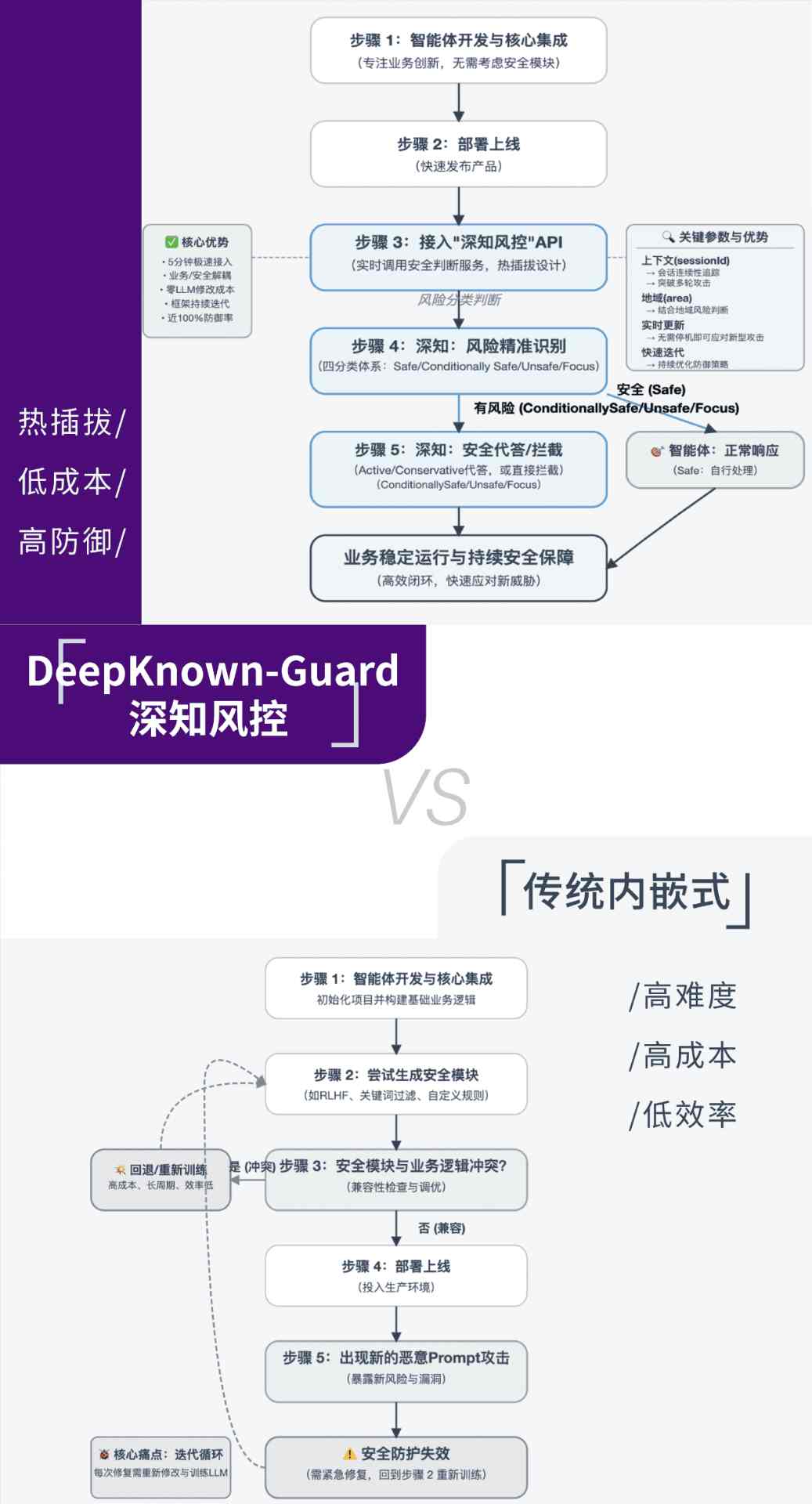 深知风控DeepKnown-Guard框架(见上图二)代表了一种基于专用模型组合的、外部化、低耦合的安全防护新范式,旨在通过API调用实现安全服务的热插拔(Hot-Pluggable),从而彻底解耦安全与业务逻辑。
