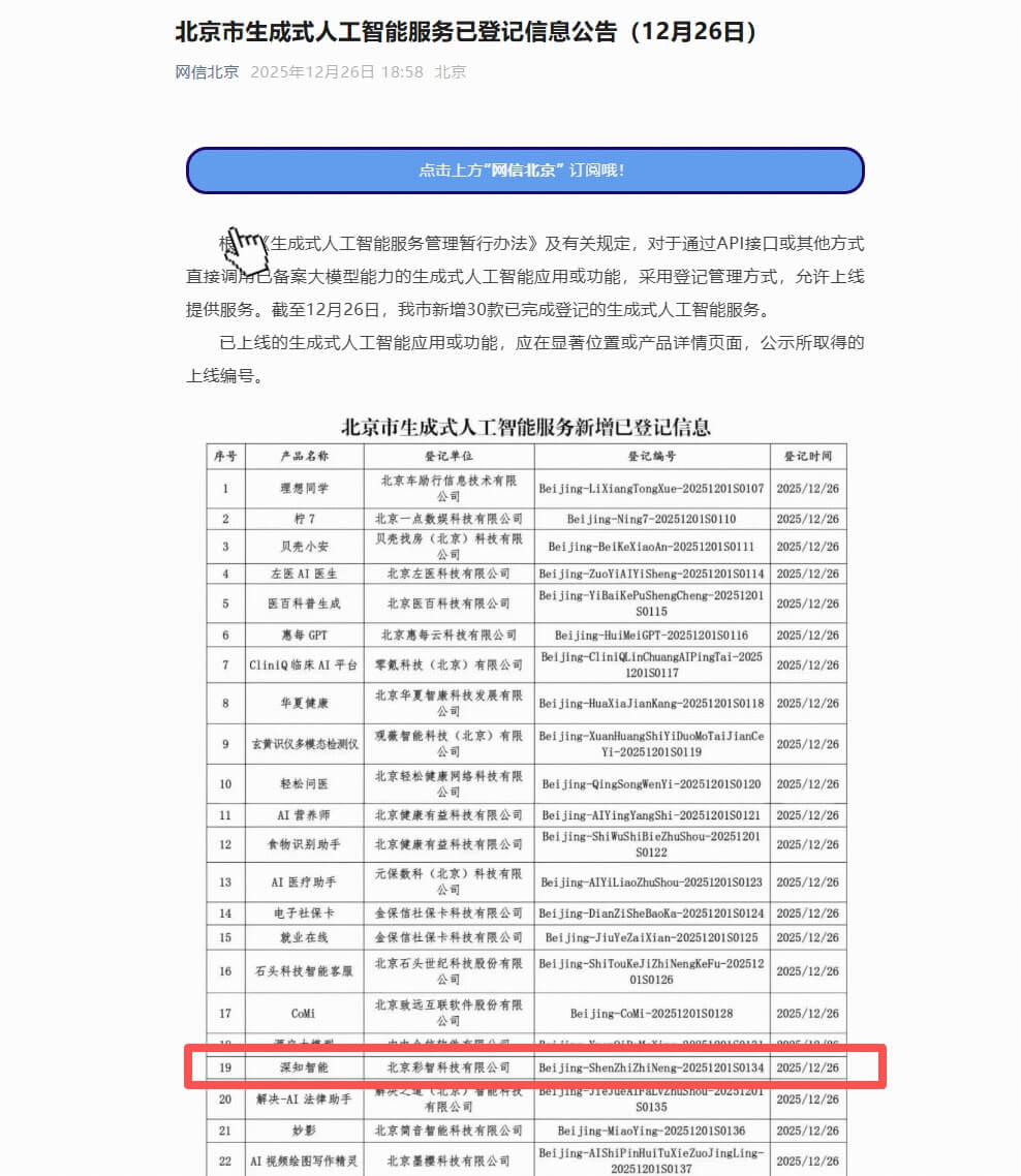 12月26日,北京市网信办正式发布了最新一批生成式人工智能服务登记信息公告,我公司“深知智能”产品,成功通过了国家生成式人工智能服务登记。